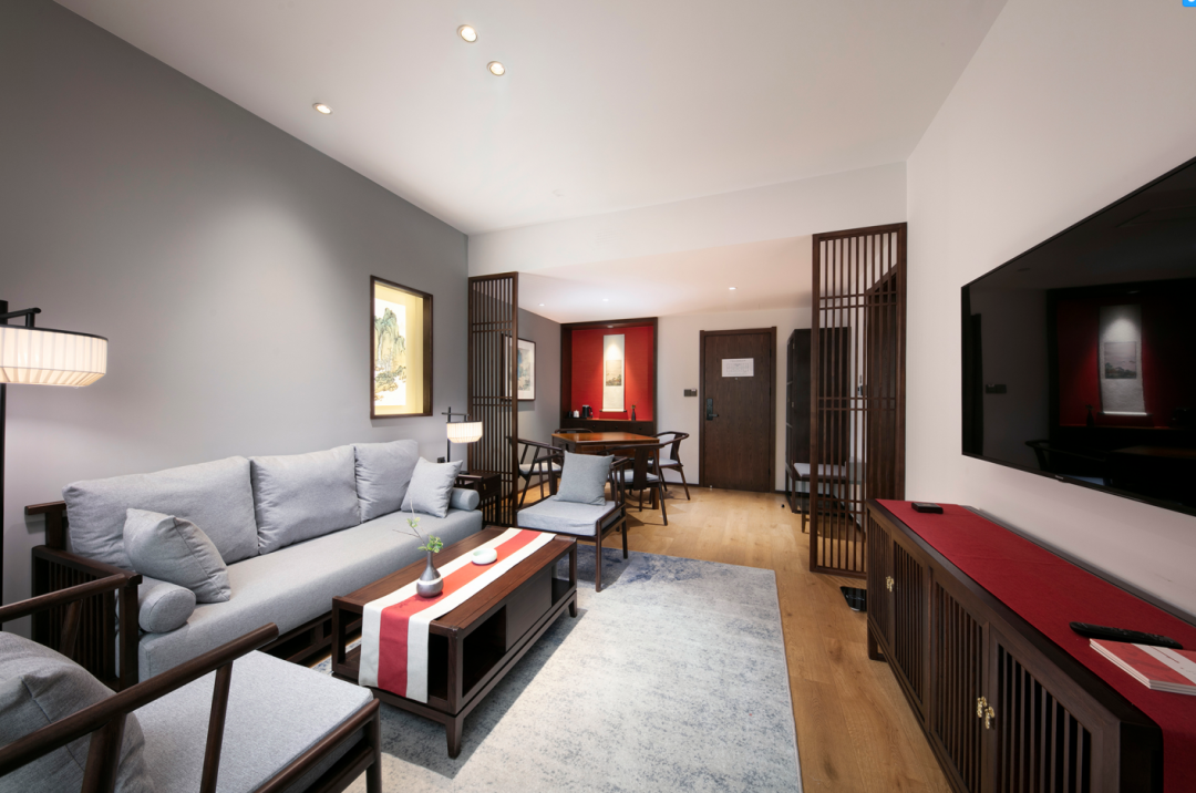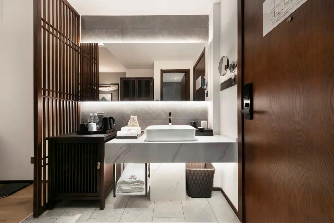 客房细节处更见品质与格调。房间风格简洁却独特、客房的配色相当典雅搭配中式家居设计低调却奢华。