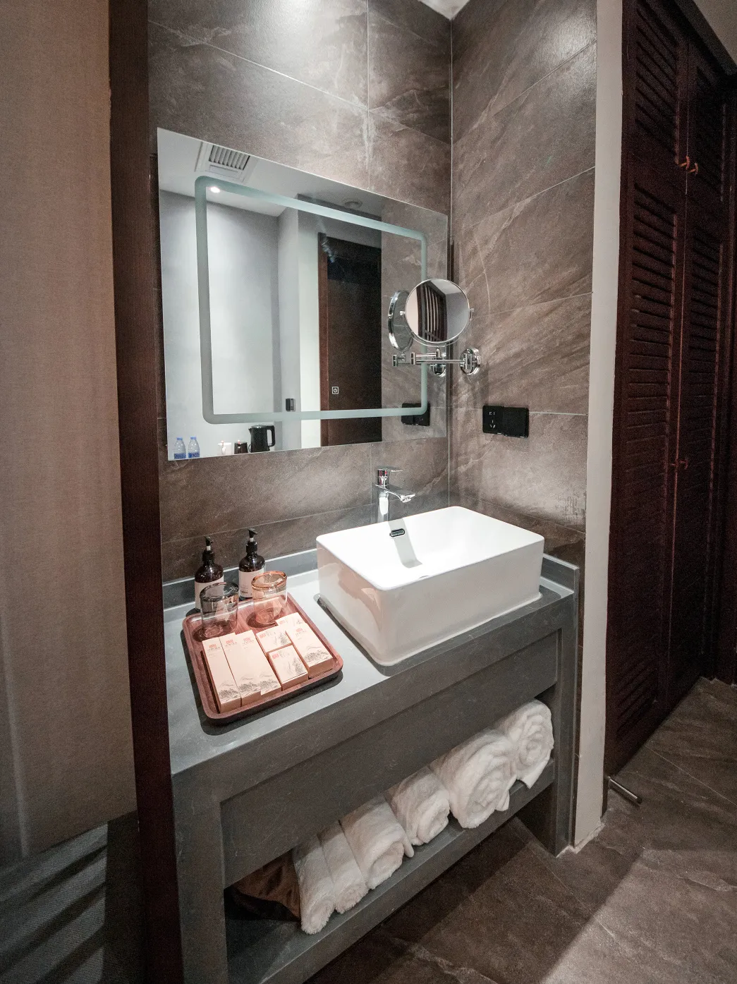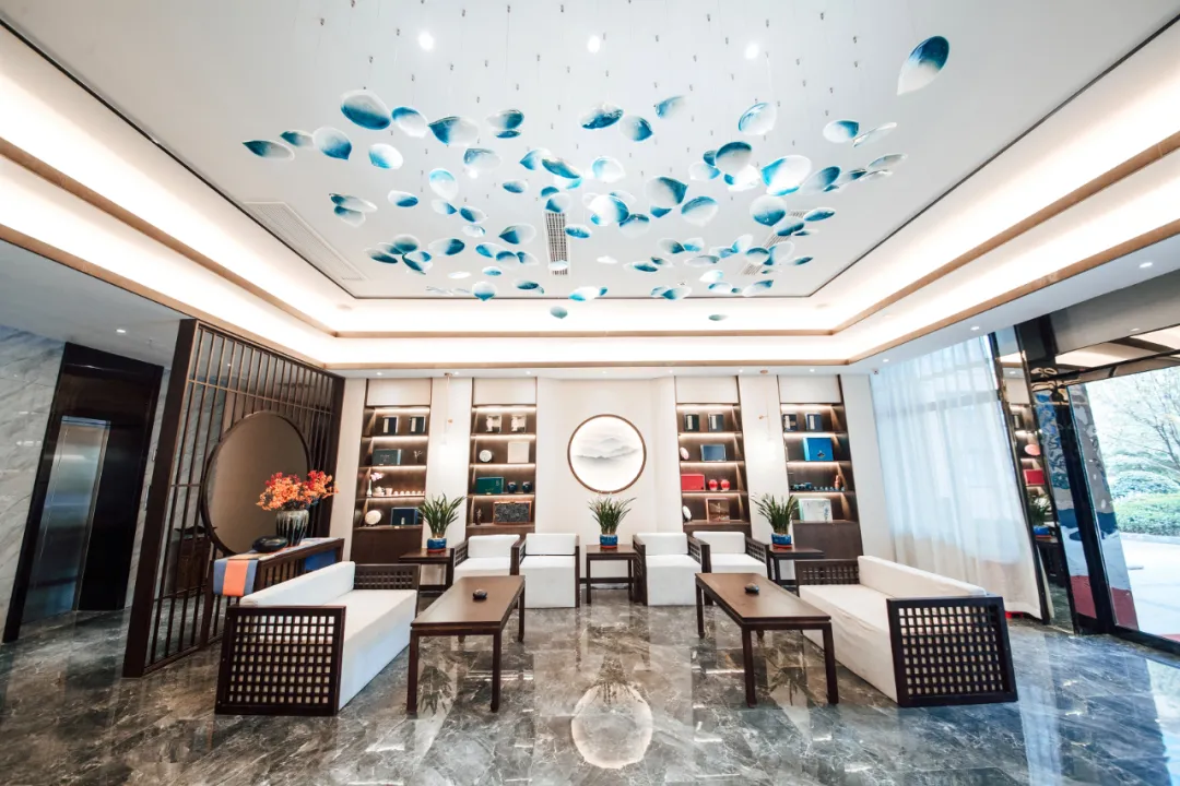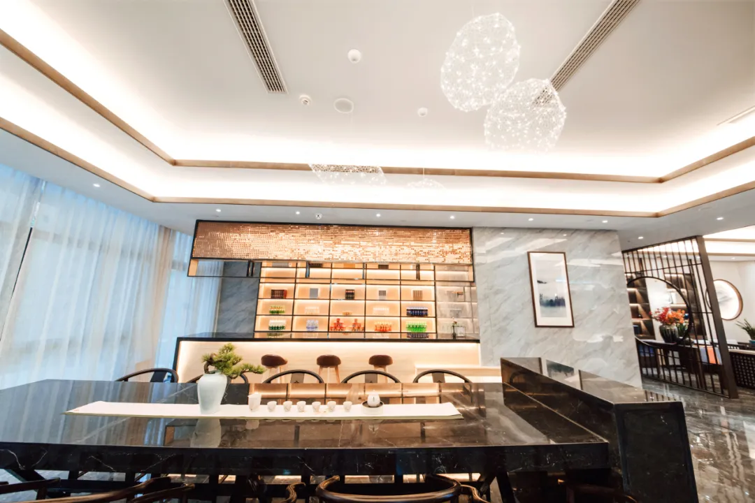 酒店大堂大面积以木质为主,墨白基调静谧清新,盆景逑然而立,种类繁多的古色古香的茶具和艺术插花,透露出古朴内敛的中式韵致,在柔和的灯光渲染下,彰显宽阔大气的空间质感。