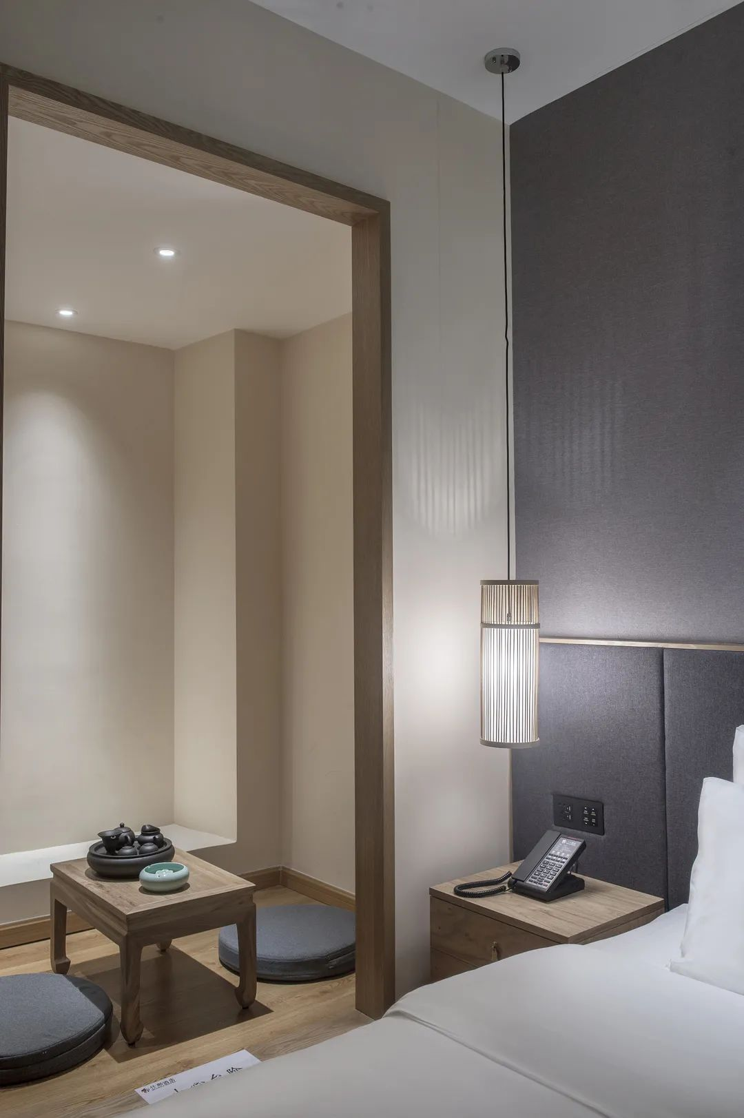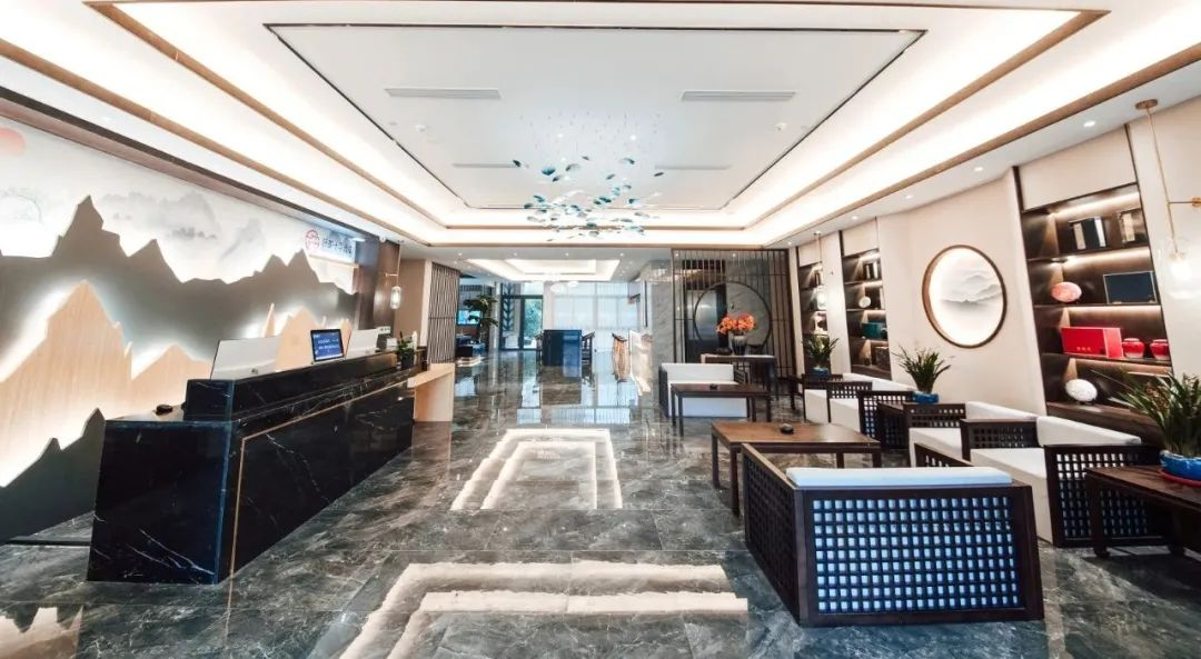 酒店大堂大面积以木质为主,墨白基调静谧清新,盆景逑然而立,种类繁多的古色古香的茶具和艺术插花,透露出古朴内敛的中式韵致,在柔和的灯光渲染下,彰显宽阔大气的空间质感。