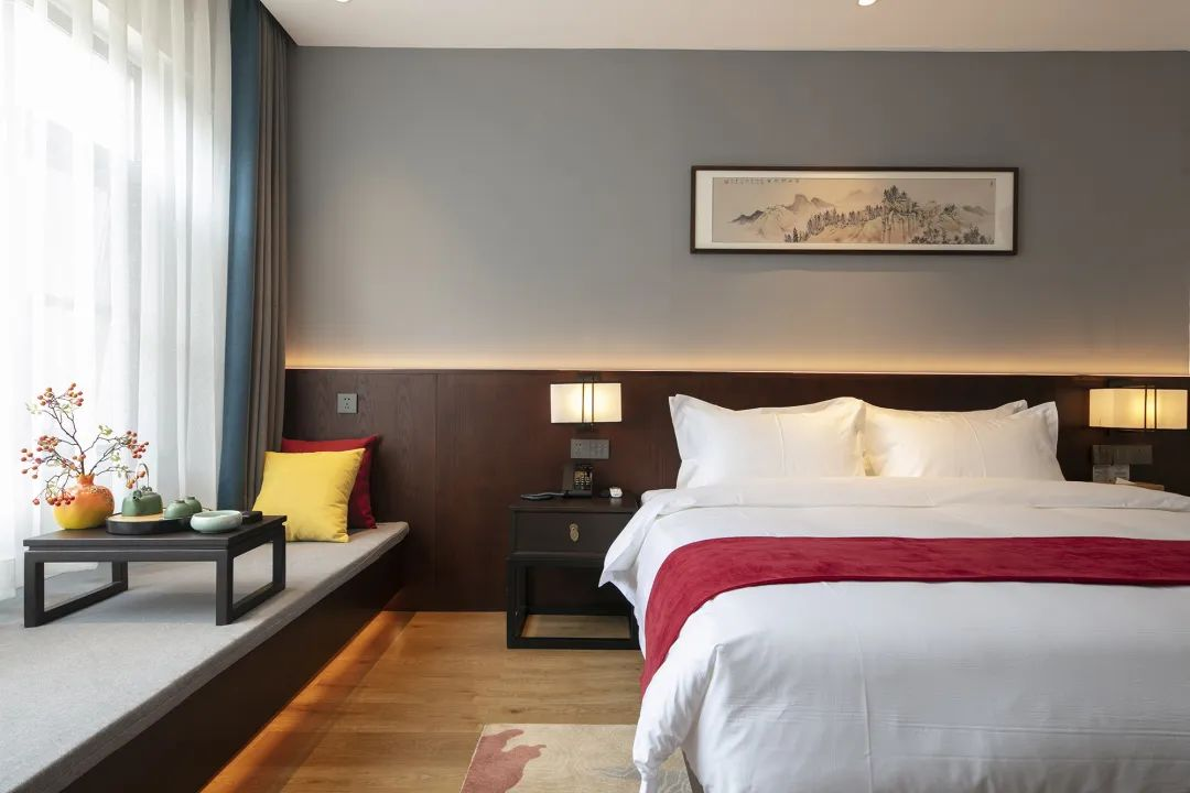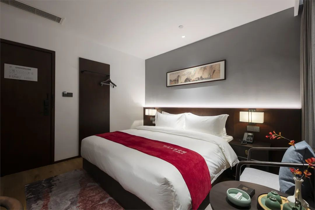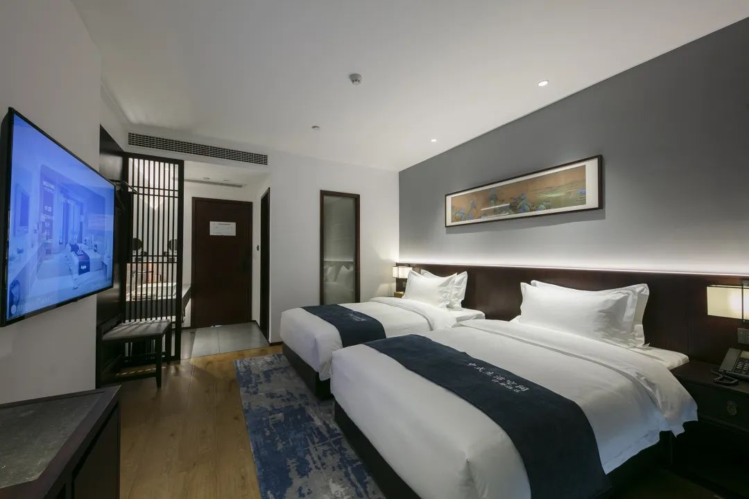 每间客房均配备大屏幕智能液晶电视,舒适贴身的优质床品,护肤柔和的纯棉毛巾,醇香浓郁的定制洗护5件套,电动智能窗帘,高速光纤无线WIFI,更有意蕴万千的茶室、书房等公共空间提供给客人免费使用。