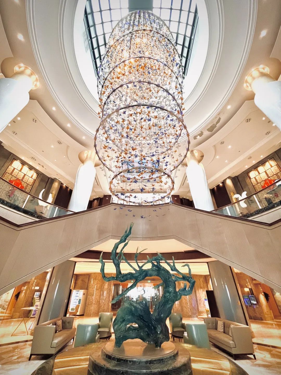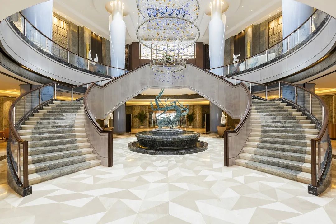 DDA骆丹国际酒店设计(香港)有限公司总裁亲自设计,融入充满神秘感的古堡造型,用“蝶变新生”的主题概念设计,不仅将酒店的外观设计成蝴蝶的形状,酒店蓝色色调装饰及顶部的玻璃天顶,将“洞林”的湖光引入酒店之内,真切地为宾客营造出“置身湖畔”感。酒店大堂从天而降的1666只彩蝶吊灯、湖色的石质饰品、环抱状的楼梯设计,以及酒店下沉式建筑代入感,又让人仿佛一步步进入了洞林湖底的奇幻世界。