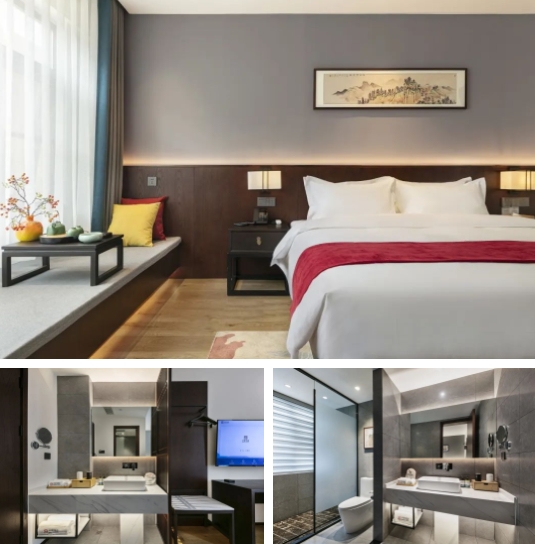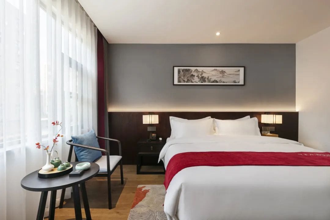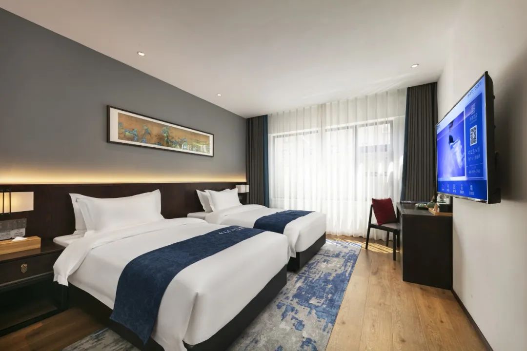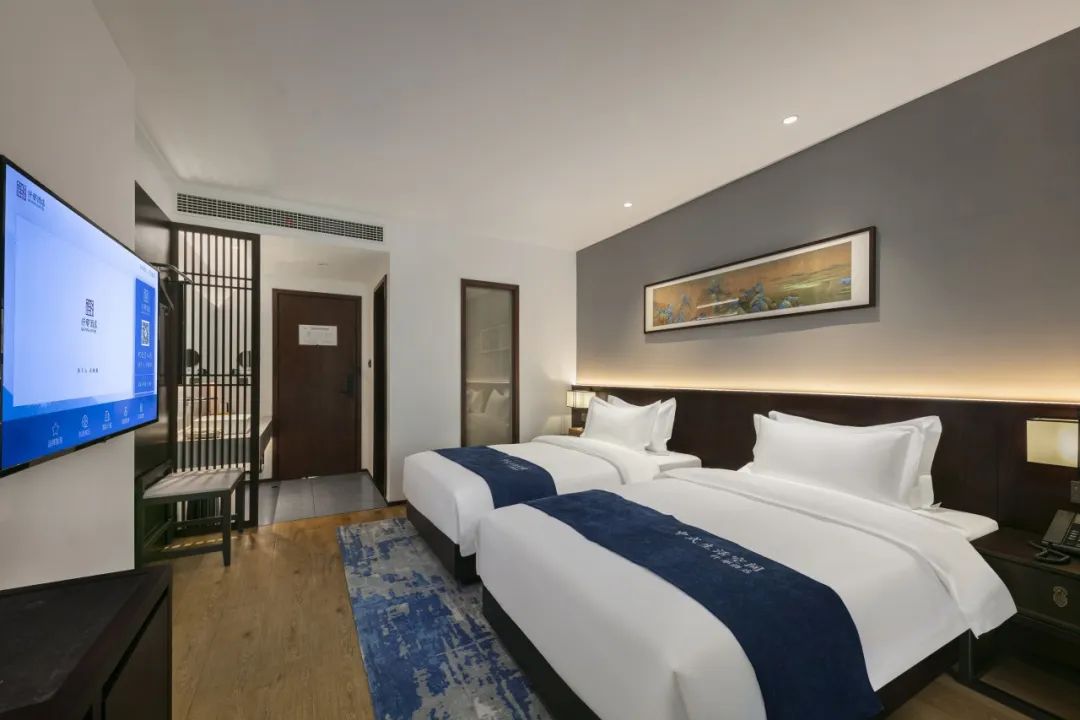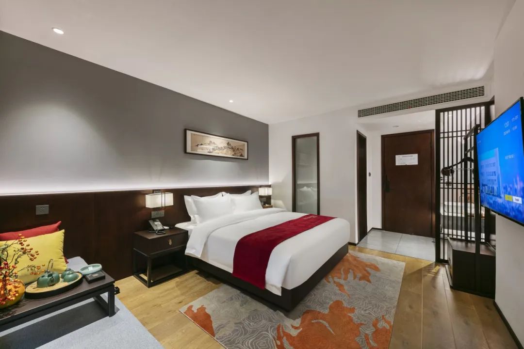 每间客房均配备大屏幕智能液晶电视,舒适贴身的优质床品,护肤柔和的纯棉毛巾,醇香浓郁的定制洗护5件套,电动智能窗帘,高速光纤无线WIFI,更有意蕴万千的茶室、书房等公共空间提供给客人免费使用。